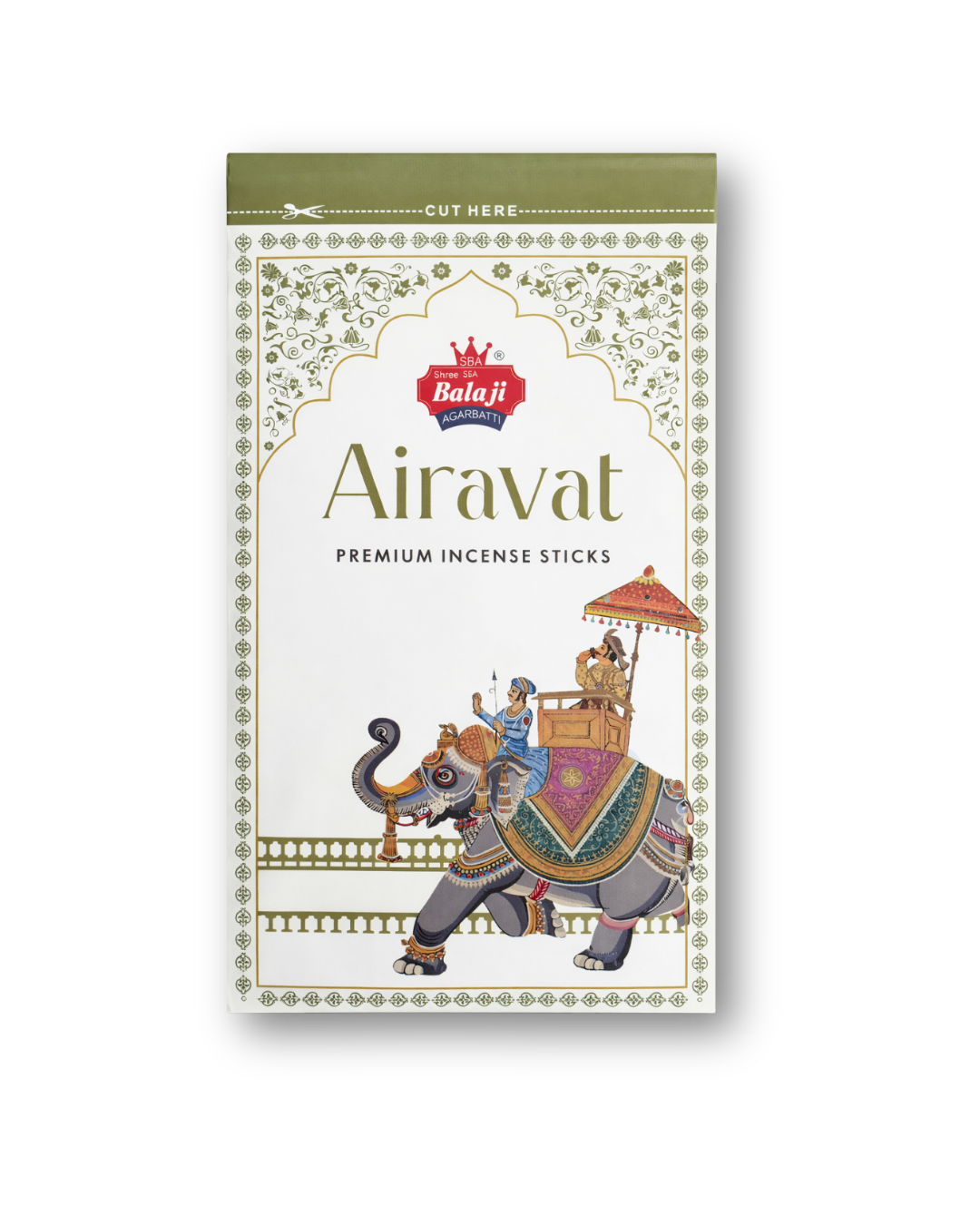 Airavat Premium Incense Sticks is a premium incense product from Shree Balaji Agarbatti. The packaging reflects a royal and traditional Indian aesthetic, symbolizing purity, elegance, and devotion.